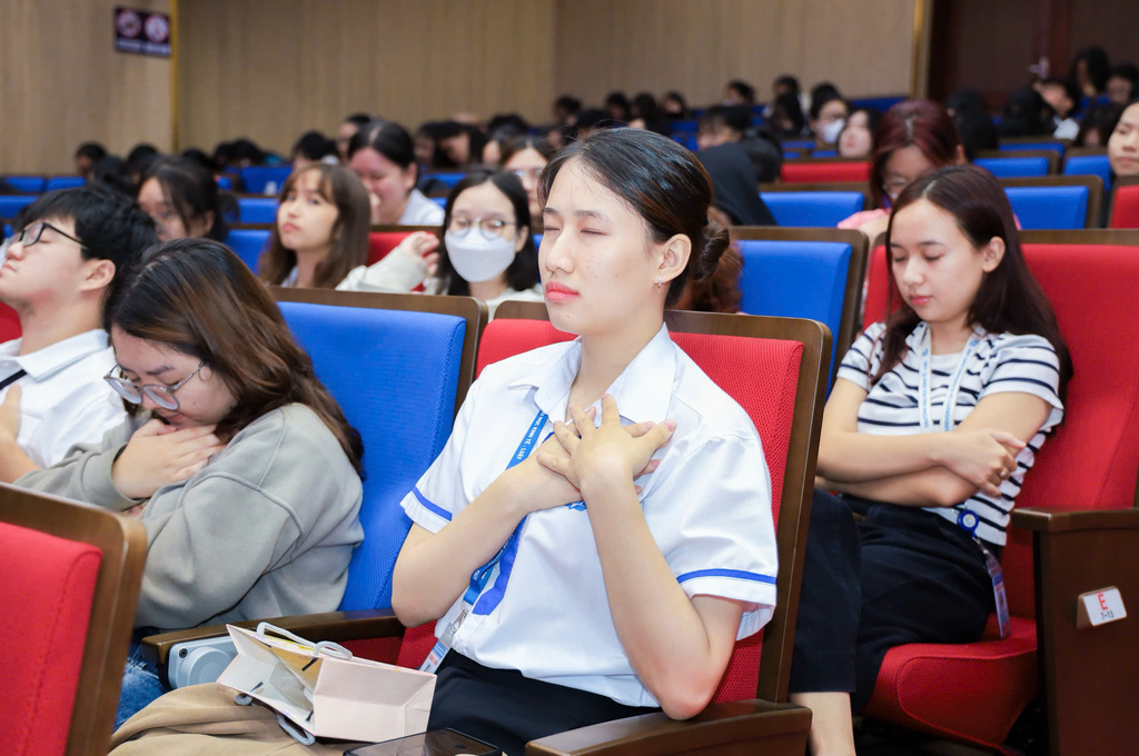 Điều khiến gần 400 sinh viên có mặt trong hội trường bất ngờ là khi bạn Ngân với đôi mắt nhắm kín, trong tiếng nhạc nhẹ nhàng bạn thực hiện yêu cầu nói lên lời cảm ơn trong khi thực hiện trải nghiệm cầm một cái chén và một đôi đũa. Ngân bồi hồi, xúc động cảm ơn cô chú nông dân đã làm ra hạt gạo để bạn được ăn no, được lớn lên bằng sự vất vả một nắng hai sương của cô chú nông dân.
