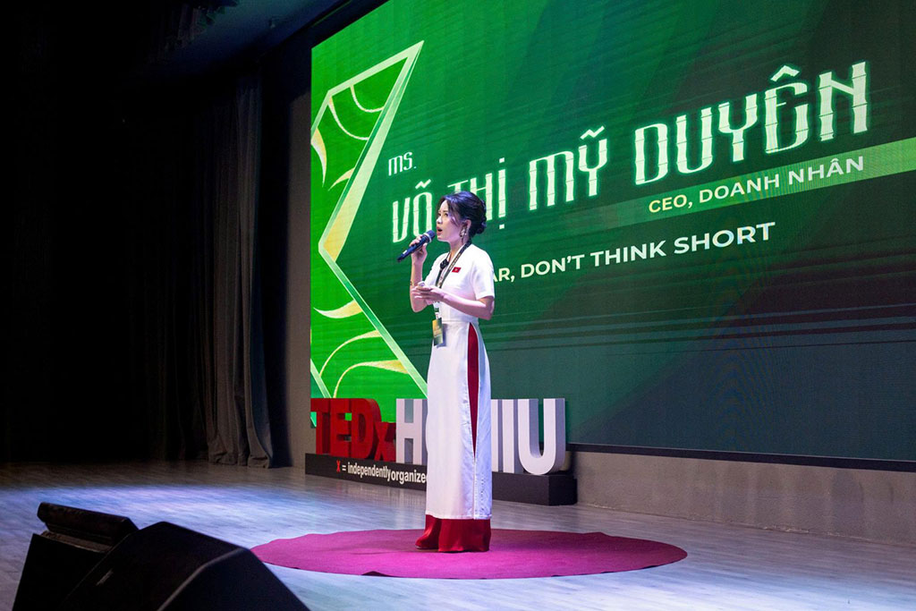 Tại sự kiện, Thạc sĩ Võ Thị Mỹ Duyên (Facebook Duyên Mây) – Giám đốc Đào tạo Học viện Kỹ năng VTALK, Doanh nhân TP.HCM tiêu biểu 2024, Đại sứ Talent Generation của UNESCO-CEP, đồng thời là người được biết đến rộng rãi với thương hiệu “Diễn giả Áo Dài”, đã chinh phục khán phòng bằng bài diễn thuyết mang tên “To Go Far, Don’t Think Short” (tạm dịch: Muốn vươn xa – đừng nghĩ ngắn).