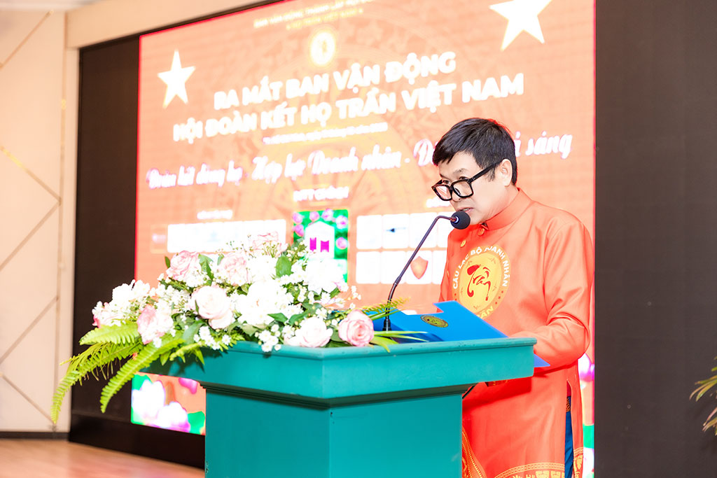 Phát biểu tại buổi lễ, ông bày tỏ niềm xúc động và vinh dự khi được tin tưởng giao trọng trách, đồng thời nhấn mạnh: “Việc thành lập Hội Đoàn Kết Họ Trần Việt Nam không chỉ là nhu cầu tự nhiên của bà con trong dòng tộc, mà còn là trách nhiệm thiêng liêng của thế hệ hôm nay – nhằm tiếp nối truyền thống đoàn kết, nhân nghĩa và cống hiến mà cha ông đã gây dựng suốt hàng nghìn năm qua.”