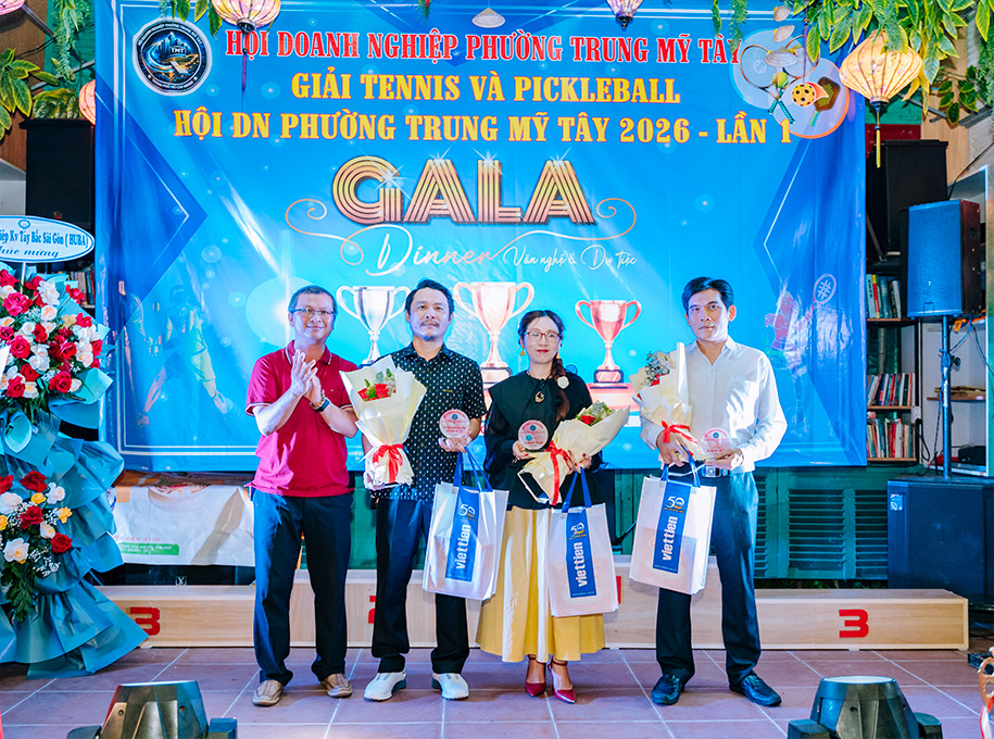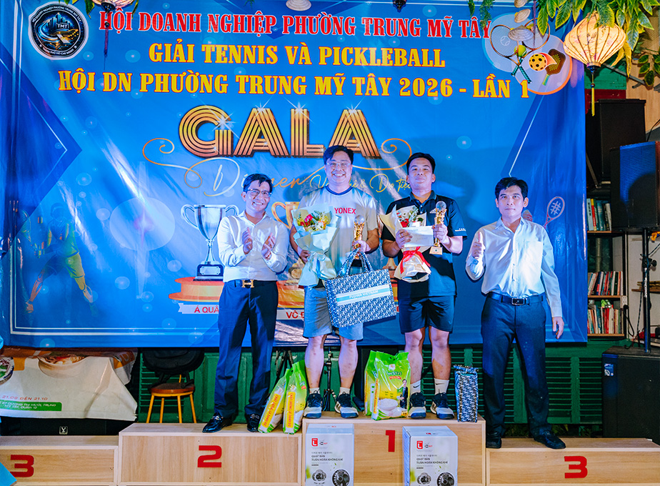 Lãnh đạo Hội Doanh nghiệp phường Trung Mỹ Tây trao giải Nhất, Nhì, Ba cho các vận động viên đạt giải ở bộ môn Tennis
