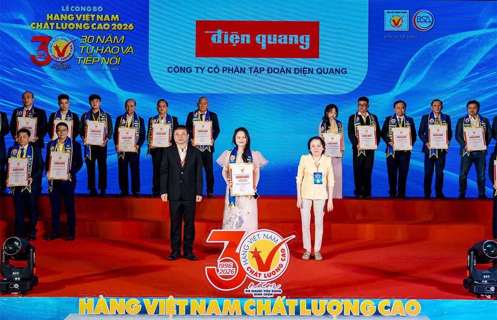 Năm 2026, Điện Quang tiếp tục được vinh danh tại chương trình Hàng Việt Nam Chất Lượng Cao, đánh dấu cột mốc 30 năm liên tiếp doanh nghiệp nhận được sự tin chọn từ người tiêu dùng trên cả nước.